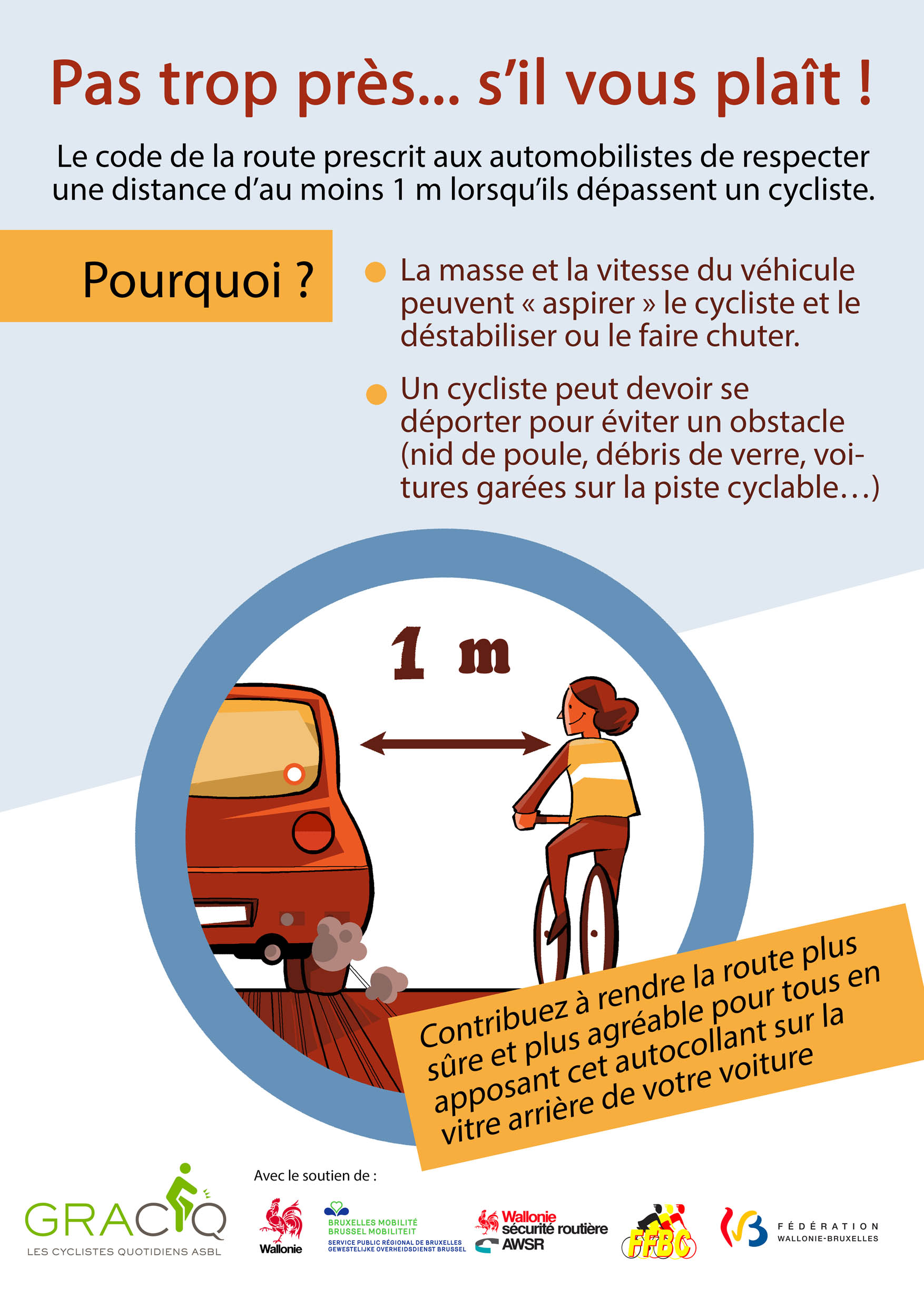 Fin 2016 nous vous annoncions notre collaboration avec le Gracq dans le but de nous impliquer dans l’amélioration de la sécurité des cyclistes. Cette collaboration se concrétise dès à présent au travers de la campagne « pas trop près s’il vous plait » qui a débuté à la rentrée de septembre. Les médias en ont déjà fait un large écho, mais il nous appartient à présent de poursuivre l’action notamment au moyen de l’autocollant reçu avec cet envoi et destiné à être apposé sur la vitre arrière de votre véhicule. Si vous ne possédez pas de voiture, nous vous invitons à le transmettre à un proche, un ami, un voisin, en lui demandant d’en faire bon usage.