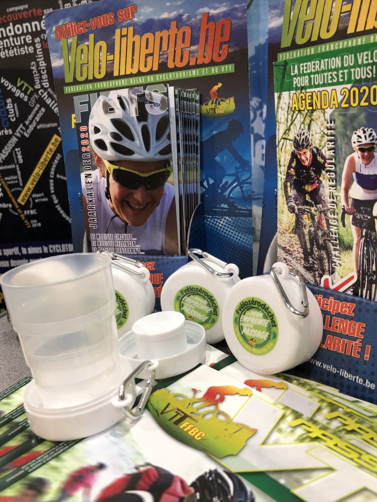 La première démarche mise en place consiste à informer nos affiliés sur les différentes alternatives existantes. Afin d’atteindre notre but un gobelet réutilisable a été créé afin de supprimer dans un avenir proche les gobelets jetables sur les ravitaillements de nos brevets. Il a été distribué lors du salon vélofollies à chaque membre de la Fédération.