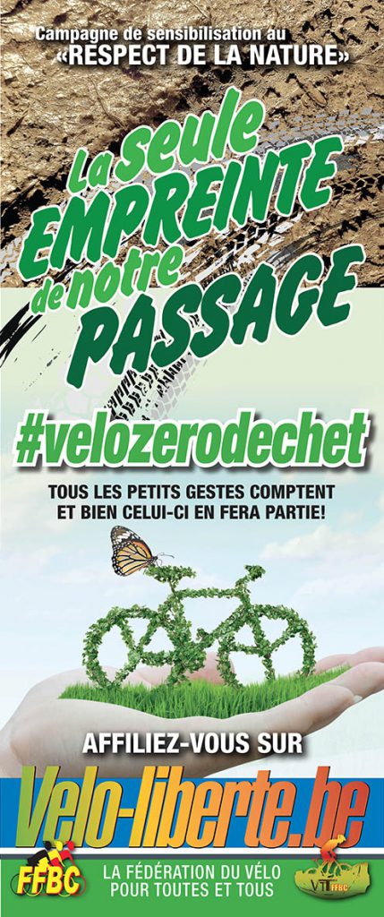 Soucieuse de notre belle planète, la Fédération Francophone Belge du Cyclotourisme et du VTT lance une campagne de sensibilisation #velozerodechet auprès de ses clubs affiliés, de ses membres et de même qu’aux non affiliés présents sur les organisations de notre sport de loisir et de découverte qu’est le Cyclo-tourisme et le Vélo Tout Terrain.
